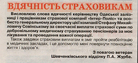 Газета «Чорноморський гудок» (№10 від 11.03.2016 р) Одеської залізниці розмістила подяку ветерана Шевченківського відділку дороги Журба П.А. на адресу страхової компанії «ІНТЕР-ПОЛІС» та особисто Голови правління (Генерального директора) компанії Совинського С.М. за допомогу в лікуванні та проведенні операції в зв'язку з проблемами зі здоров'ям: